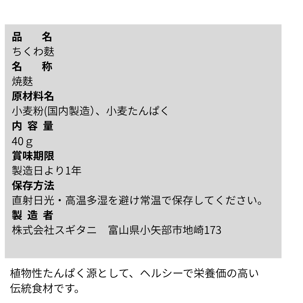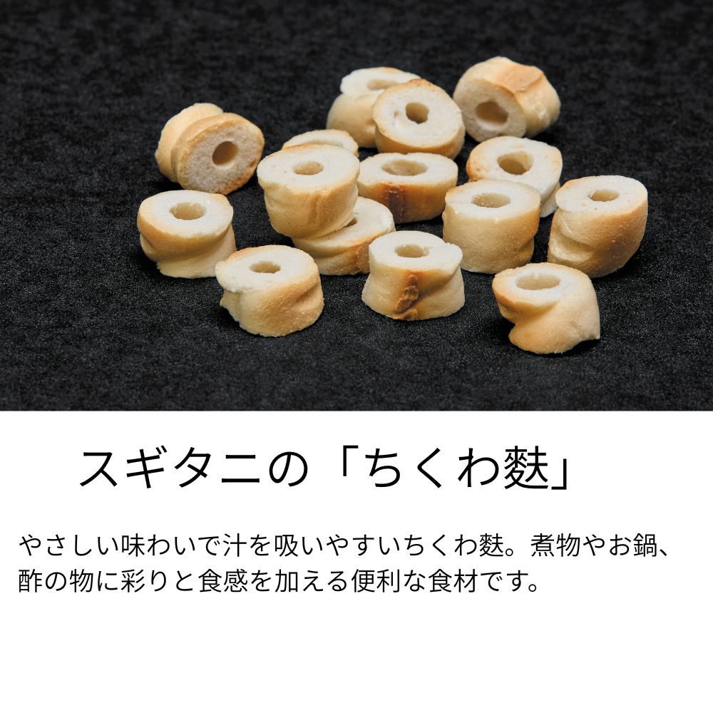 まるでちくわのような見た目が楽しい「ちくわ麩」は、煮物や鍋料理はもちろん、酢の物などの副菜にもぴったり。植物性たんぱく質が豊富で、健康志向の方にも嬉しいヘルシー食材です。味しみの良さと、もっちりとした独特の食感がクセになる美味しさ。常温保存ができるので、ストックしておけば忙しい日にもサッと使えて便利です。富山県の老舗・スギタニ製造で安心の品質をお届けします。